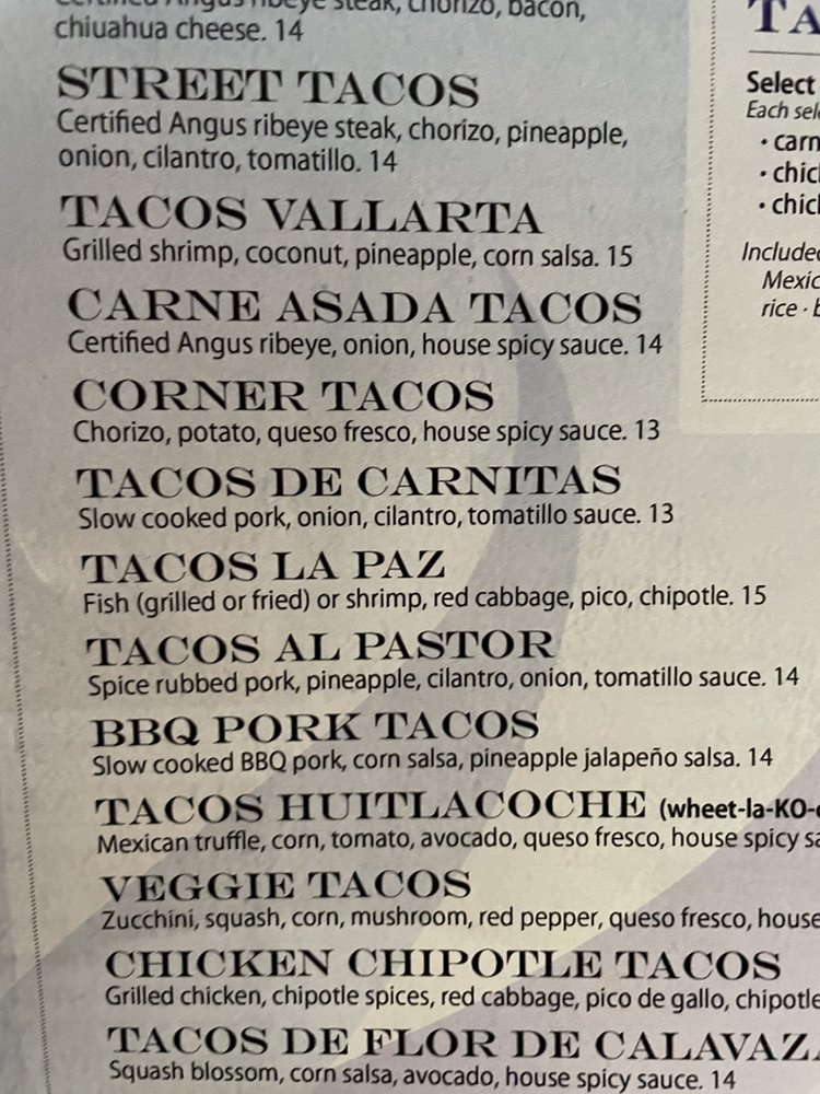 Wheet-la-ko-chay. Mexican truffle, com, tomato, avocado queso fresco, and house spicy sauce.